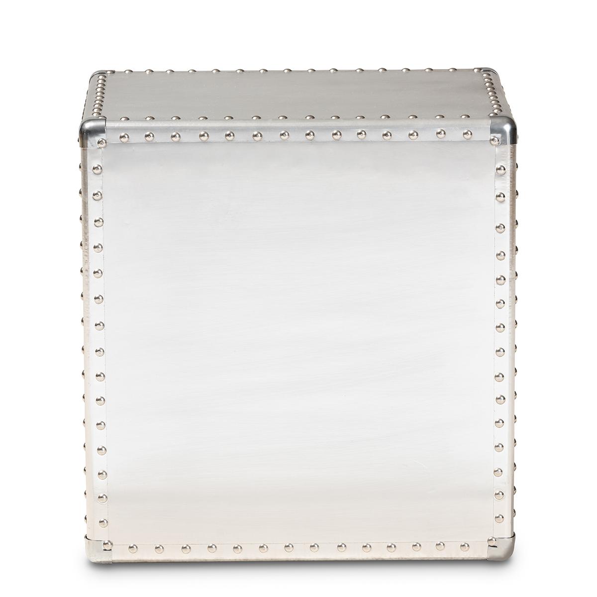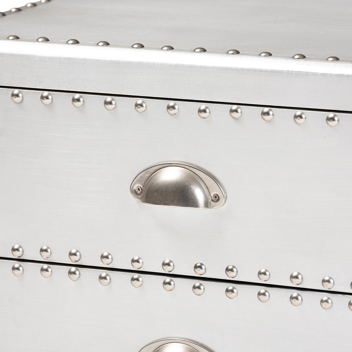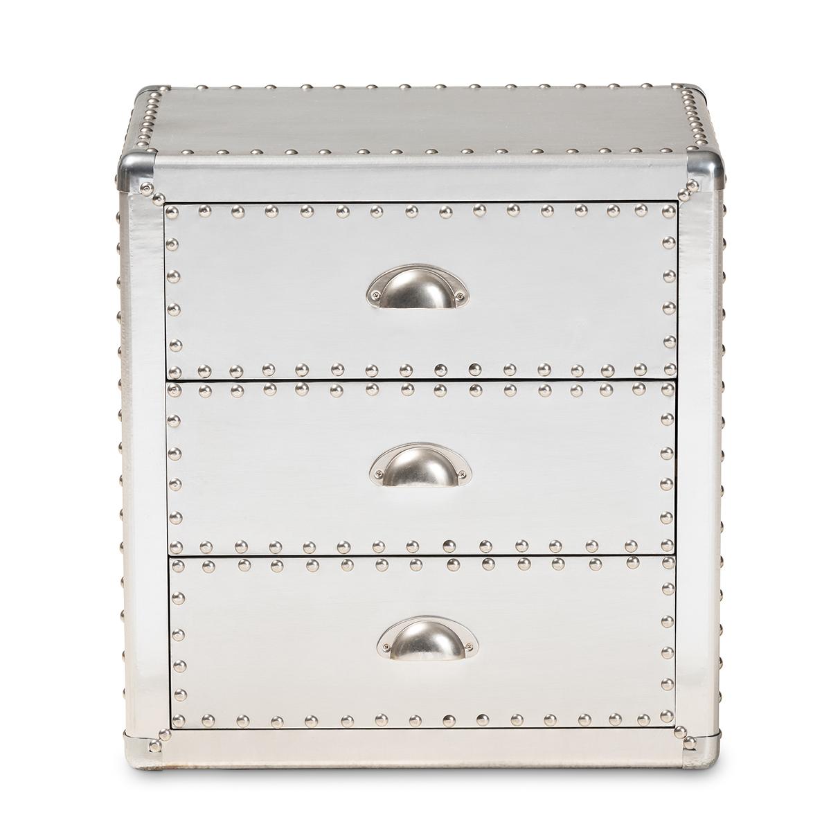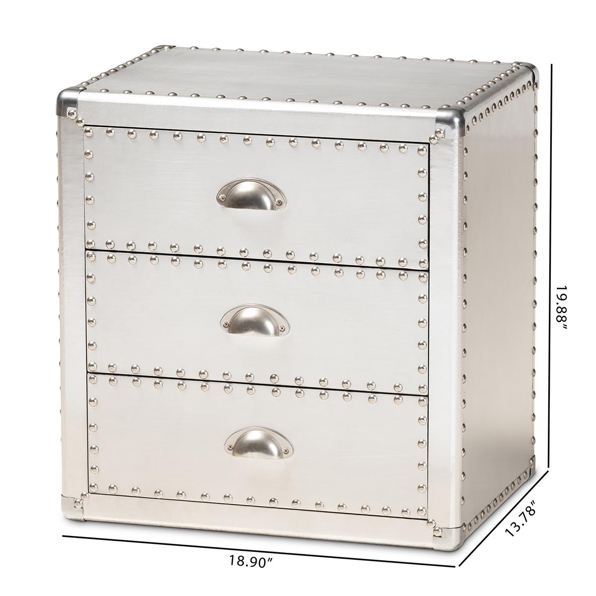 The Baston Studio Armel nightstand is constructed from metal and features cool rivet detailing along its edges. Three drawers provide space to keep bedside essentials organized and have polished silver metal drawer handles that add a sleek touch. Inspired by vintage storage trunks, the Armel is fitted with corner protectors.