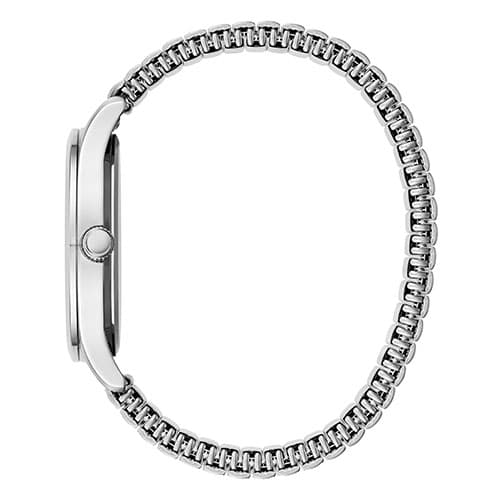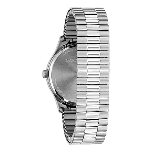 This Mens Caravelle silver tone expansion band watch has a 3 hand date feature and easy to read numerals with bold 24-hour design on a dark blue dial that is accented with metallic indexes. It has a comfort-fit expansion bracelet and a stainless steel case. Wipe with a soft dry cloth to clean. Case size: 40.2mm.Style 43B161.Limited Manufacturer´s Warranty.