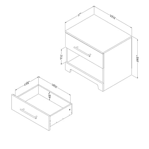 This South Shore Primo 1 drawer nightstand is a simple, elegant piece that will only make your bedroom that much better. It provides the storage space you need, while giving the room a trendy, uncluttered look. It features 1 practical drawer with modern metal handles in a matte black finish and 1 open easy-access storage space. Made with laminated Particleboard and Metal. Wipe with a soft dry cloth to clean. Dimensions: 19.75”H x 22.25”W x 17”D.