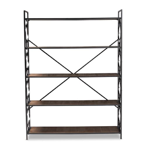 This Baxton Studio Mirna 5 shelf quatrefoil accent bookcase has spacious shelving and exquisite quatrefoil accents that make it a chic addition to any space. A sturdy black iron metal frame supports 5 large shelfs crafted from MDF wood, ideal for displaying books, pictures frames, and more. Quatrefoil embellishments on the sides of the bookcase add a decorative touch, while a crisscross stretcher on the back of the bookcase provides structural support. Made with Particle Board. Wipe with a soft dry cloth to clean. Dimensions: 65"H x 48.8"W x 15.7"D.
