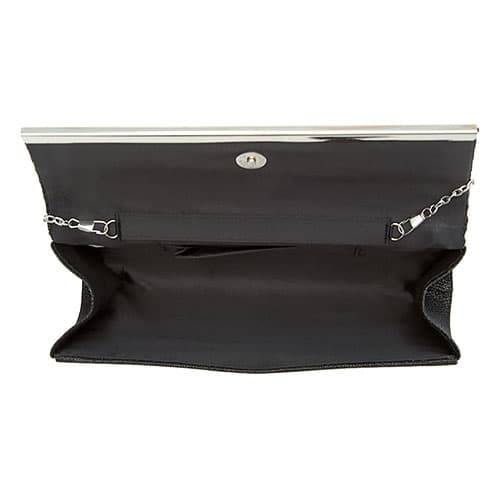 This Sasha shimmer pleated flap clutch evening bag features a snap closure with an interior pocket and removable chain strap.