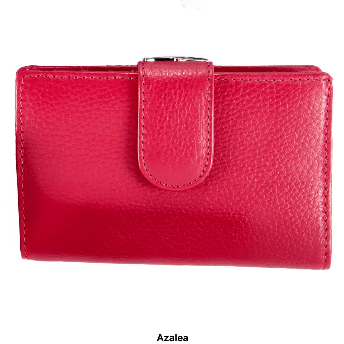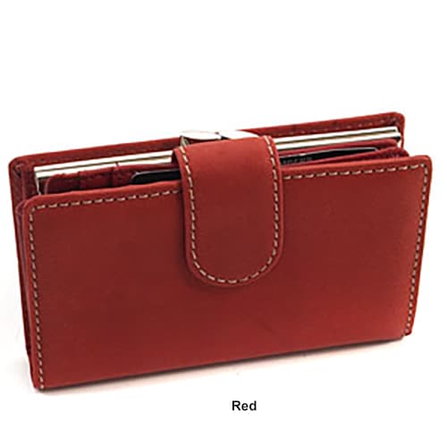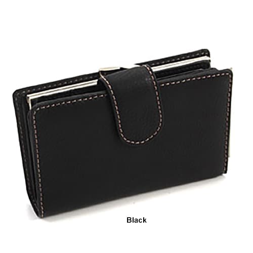 The Womens Mundi Rio tab frame indexer wallet is made of genuine leather and has a main snap closure. The fully lined interior has 17 credit card slots, 1 ID window, and other pockets that are perfect for your dollar bills and other important items! The exterior features a kiss lock pocket that is a super convenient place to put your loose change!