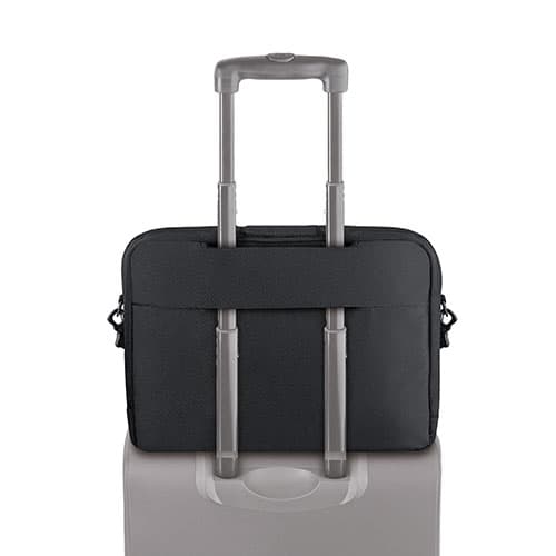 The Solo Urban briefcase showcases a padded compartment that will protect a laptop up to 17.3-inches. It features a front zip-down organizer section, a dual file section, a Rear Ride Along® strap for consolidated travel and a removable and adjustable shoulder strap. Polyester. Dimensions: 13”H x 18”W x 3.5”D.