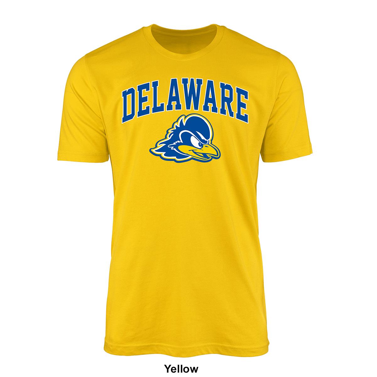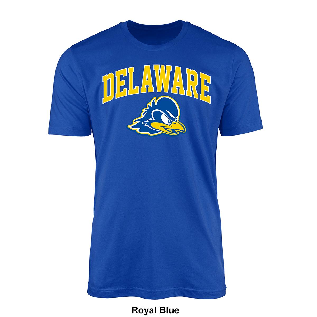 Mens University of Delaware Pride Mascot screened tee with short sleeves and a crew neck. Cotton blend. Machine wash. Tumble dry.