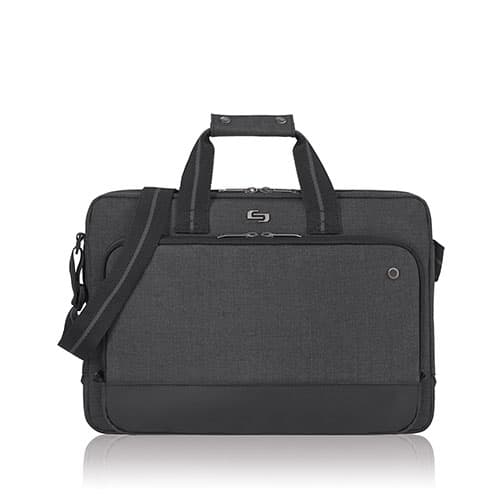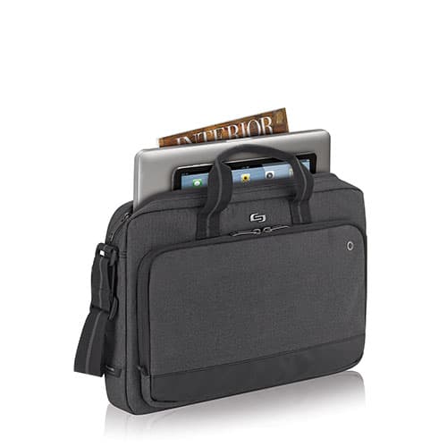 The Solo Urban slim briefcase showcases a padded compartment that protects 15.6-inch laptops with a dedicated interior pocket for your iPad or tablet. It features a front zip-down organizer section, padded carry handles, and an adjustable shoulder strap. Polyester. Dimensions: 12”H x 16”W x 2”D.