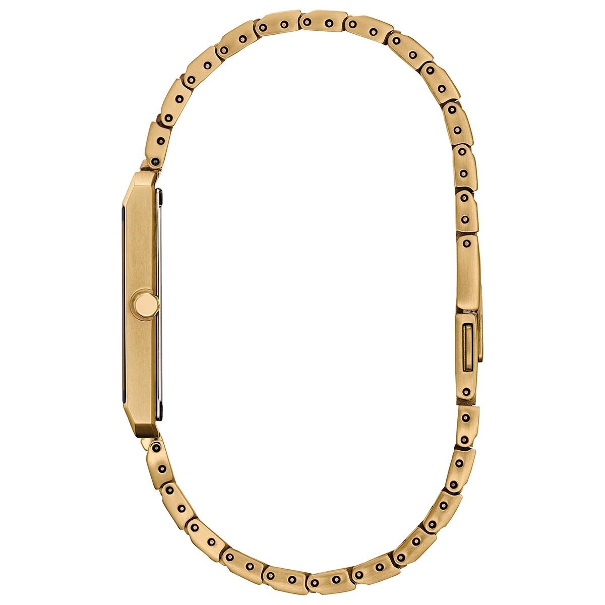 For a bold style, the Unisex Citizen® Eco-Drive small Stiletto watch is perfect for both men and women with a gold-tone stainless steel bracelet and case, and a sleek black face with a gold-tone two-hand dial. It is just 5.06mm (+/- .25mm) thick, taking advantage of our long history designing elegant, slim timepieces. It is also solar powered by Eco-Drive technology, so it will always be ready to go when you are and is secured by a push button jewelry clasp.