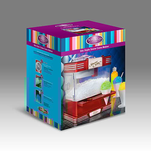 The Nostalgia™ Retro Series Snow Cone Maker creates refreshing snow cones at home anytime! Use ice cubes to make shaved ice then add your choice of flavored syrup and enjoy a cold, tasty treat that´s fun for the whole family and a great relief from the summer sun. You can even make fruit slush drinks, yogurt snow and smoothies! Designed for kitchen use, the snow cone machine can also be used in a number of other locations such as dorm rooms, offices, club houses and family or recreation rooms. Now you can enjoy the wonderful, cool taste of Snow Cones anytime in the convenience of your own home. Convenient countertop size.Side tray to hold snow cones. Works with standard ice cubes.Stainless steel ice-shaving blades. Includes 2 reusable plastic cones and ice scoop. Built-in safety switch. Dimensions: 16"H x 11"W x 13"D.Limited Manufacturer´s Warranty.