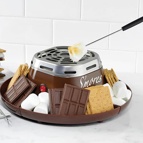 The Nostalgia™ S´mores Maker lets you bring a taste of the outdoors inside to enjoy homemade s´mores all year ´round! The simple pleasure of gooey marshmallow, chocolate and graham crackers can be yours without the hassle of building a bonfire, or dealing with those pesky mosquitos! Simply plug in, turn on and roast your marshmallow to perfection. No batteries or light bulbs needed! Perfect for guests of all ages, your family will love making s´mores anytime! Includes serving tray with 4 compartments to prepare and serve Marshmallows, Chocolate Bars and Graham Crackers. Includes 2 forks. Stainless steel housing and top cover. Cord length 35 inches. Dimensions: 5"H x 13"W x 13"D.Limited Manufacturer´s Warranty.
