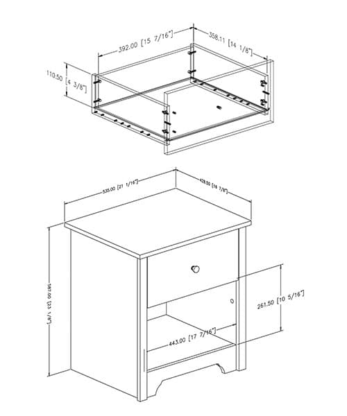 This South Shore Vito 1-drawer nightstand features embellished handles in a matte nickel finish and a decorative kick plate. It is a perfect blend of minimalist style and functionality. This nightstand will accommodate all of your storage needs! Dimensions: 23.25"H x 21.25"W x 17"D.