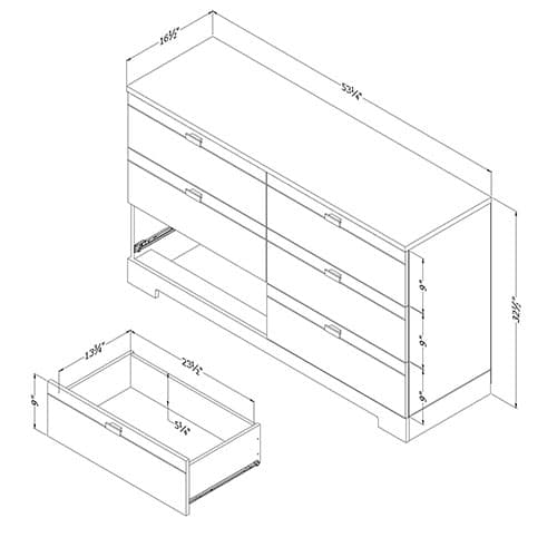 Use this South Shore Reevo 6-drawer double dresser to add storage space to your kids’ room or your own! Thanks to its neutral finish you can pair it with other décors in the colors of your choice. Dimensions: 32.5"H x 53.5"W x 16.5"D.