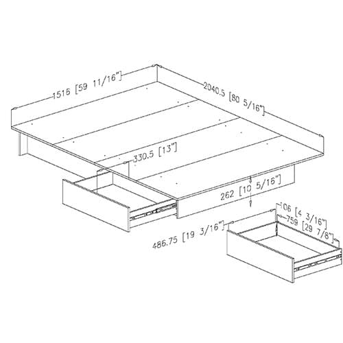 Thanks to its neutral but trendy finish and clean lines, this South Shore Step one full/queen platform bed with drawers goes well with all decors and styles. The bed features additional storage with its two drawers. Dimensions: 10.5”H x 80.5”W x 60“D