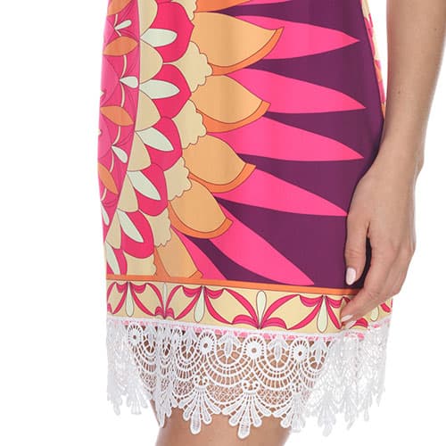 The Womens White Mark Kaia short sheath sleeveless dress showcases a scoop neck and a natural crochet lace hemline. 95% Polyester. 5% Spandex. Hand wash, hang dry.