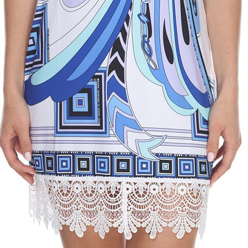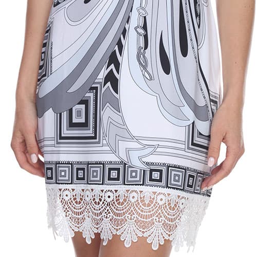 Description The Womens White Mark Quinn short sheath sleeveless dress showcases a scoop neck and a natural crochet lace hemline. 95% Polyester. 5% Spandex. Hand wash, hang dry....
