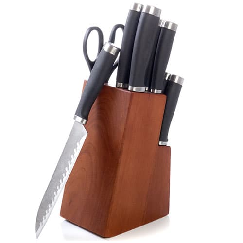 This Kitchenworks Walnut block 15 pieces cutlery set brings everything you need into your kitchen. The set includes a 7pc Santoku knife, 8" slicing knife, 8" bread knife, 6" boning knife, 5.5" Santoku knife, 5" Utility knife, six 4.5" steak knives, 3.5" paring knife, and an 8" shear. It also includes a walnut finished hardwood block. Plus each knife features soft rubber handles and a brushed satin finish.