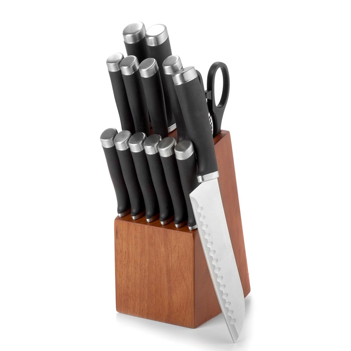 Description This Kitchenworks Walnut block 15 pieces cutlery set brings everything you need into your kitchen. The set includes a 7pc Santoku knife, 8" slicing knife, 8" bread...