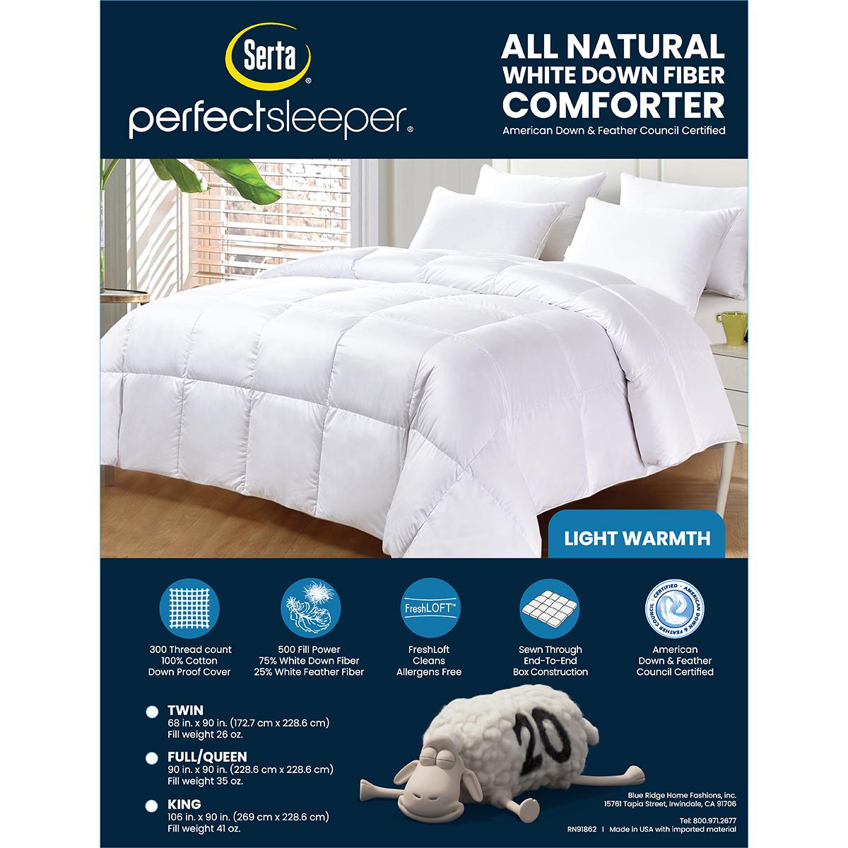 Description Now you can sleep easy with our all-natural Serta® 300 thread count white down and feather fiber comforter. You can transform your regular sleep for the ultimate...