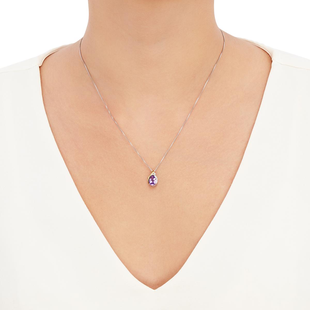 Amethyst is the birthstone for February. If your birthday is in February and you want to wear a birthstone pendant, then accessorize yourself with this beautiful Gemstone Classics™ pear amethyst pendant set in sterling silver and 10kt. yellow gold. The amethyst and white topaz pendant is a classic style with an eye-catching yellow gold accent.