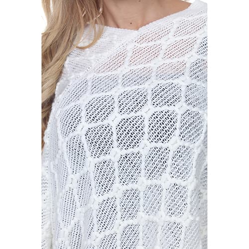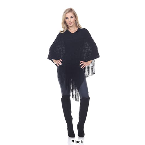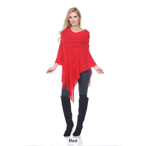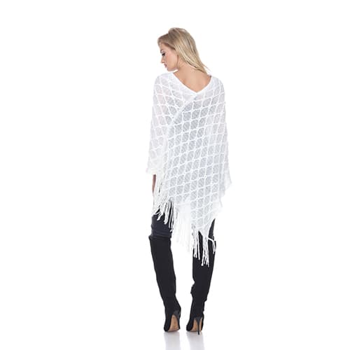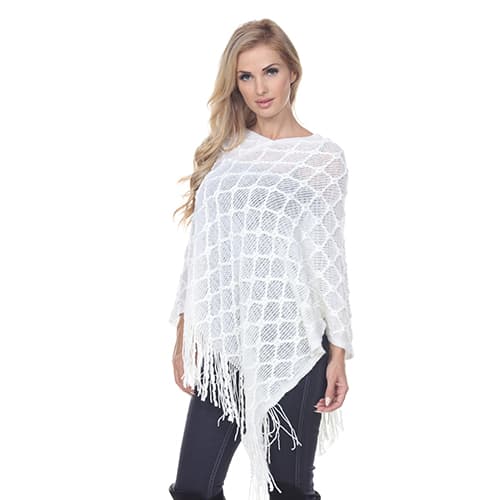 This Womens White Mark Frostine poncho features a round neck, long sleeves, and a fringed hem.