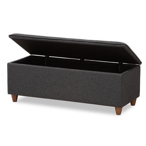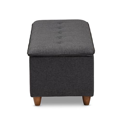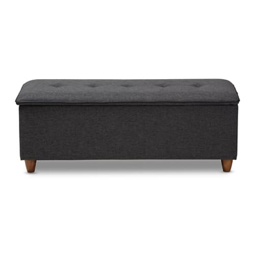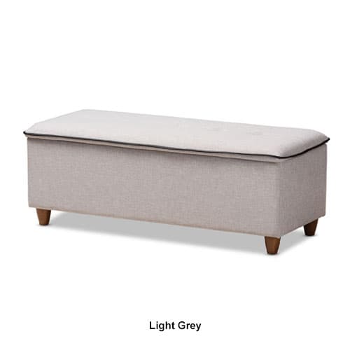 This Baxton Studio Marlisa storage ottoman bench features both storage and seating, making it a versatile addition to the home. It is upholstered in a chic neutral polyester fabric and features a plush foam padded top to provide comfortable seating. It is ideal for small spaces and is equipped with a lift-up lid that reveals storage space for pillows, blankets, and more. The solid, cone shaped rubberwood legs provide structural support and showcase a tapered look inspired by mid-century modern design. The black faux leather buttons and piping add a refined touch.