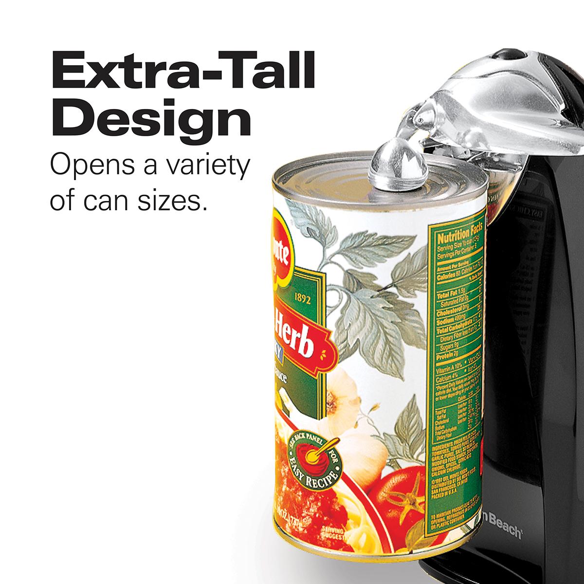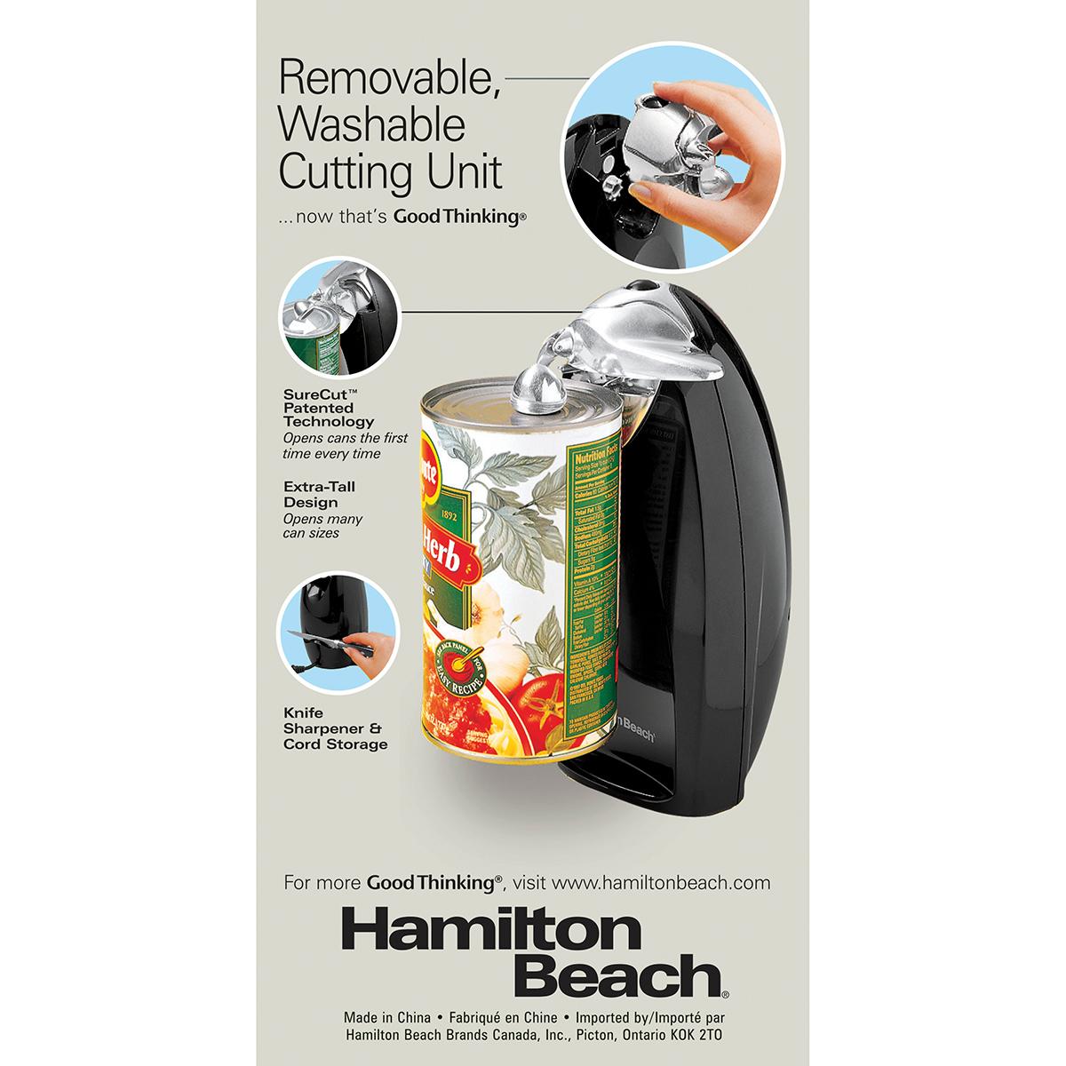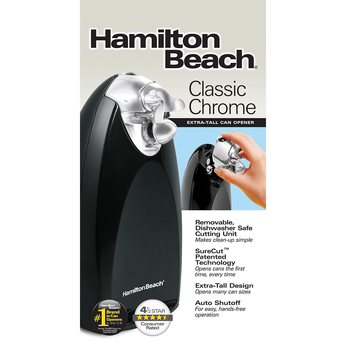 Description Hamilton Beach® Tall Can Opener. Entire chrome cutting unit removes for dishwasher safe cleaning. SureCut™ action - opens cans on the first try. Opens family-size...