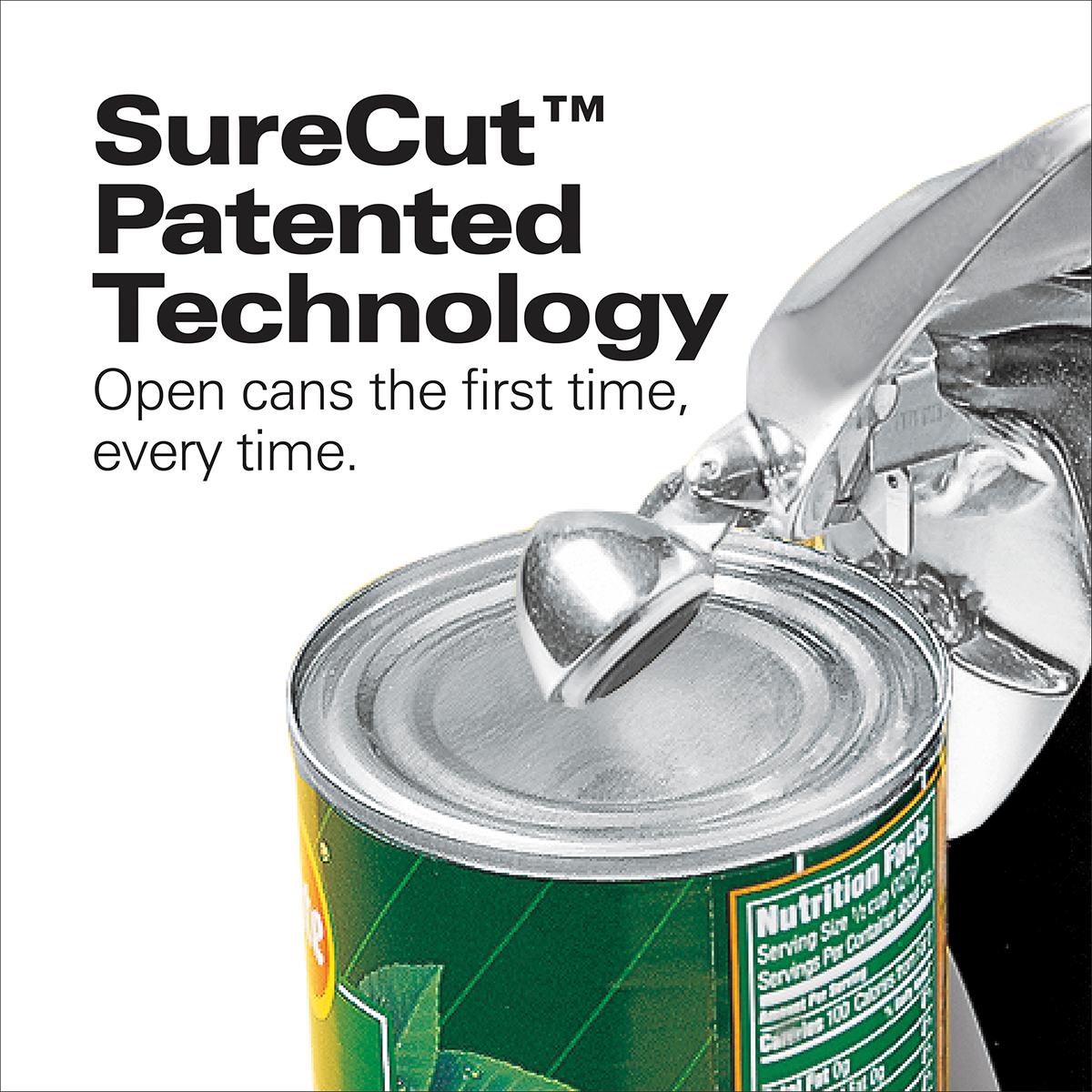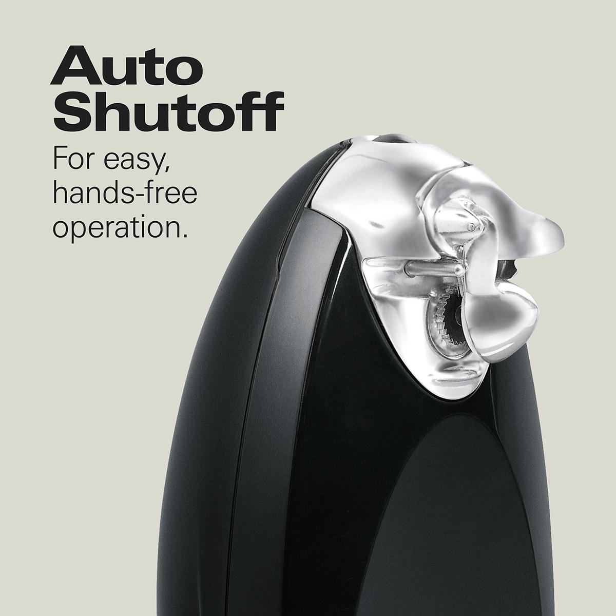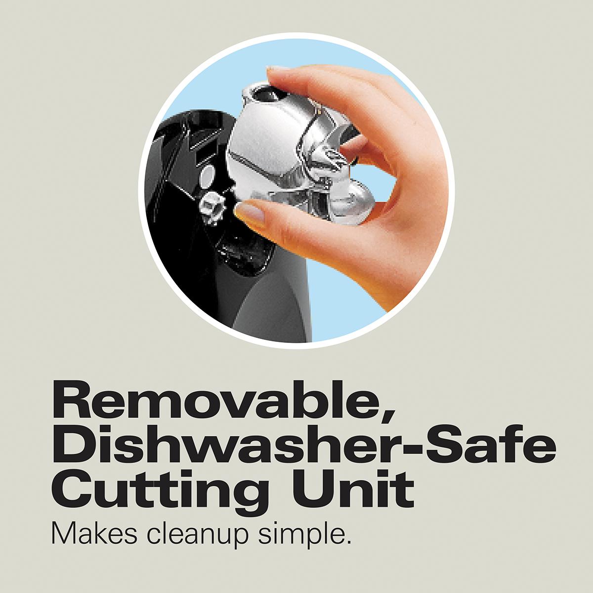 Hamilton Beach® Tall Can Opener. Entire chrome cutting unit removes for dishwasher safe cleaning. SureCut™ action - opens cans on the first try. Opens family-size and extra-large cans. Automatic shut-off, knife sharpener, bottle opener, cord storage, slim design.
