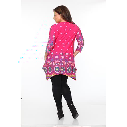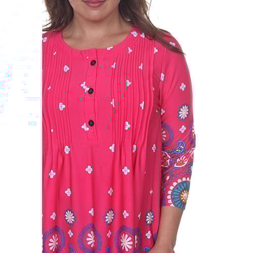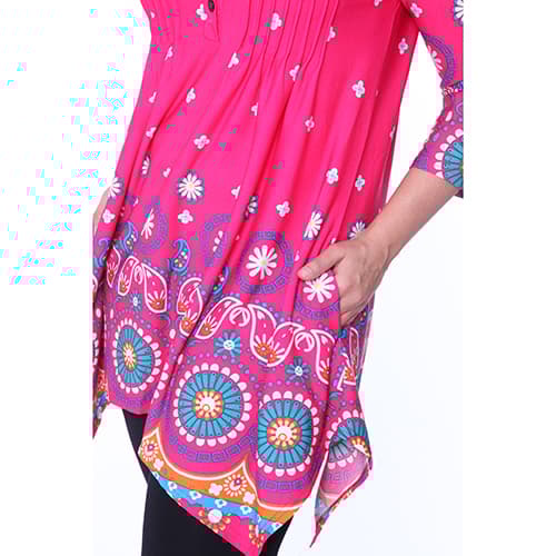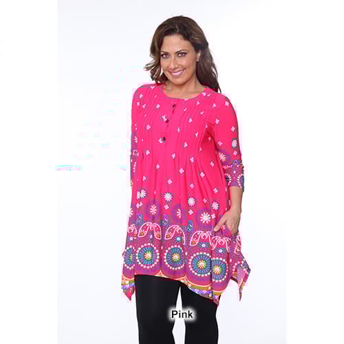 Look gorgeous and feel comfortable in this Plus Size White Mark Lucy medallion print tunic. This tunic features 2 pockets, pin tuck pleats, and a buttoned neck.