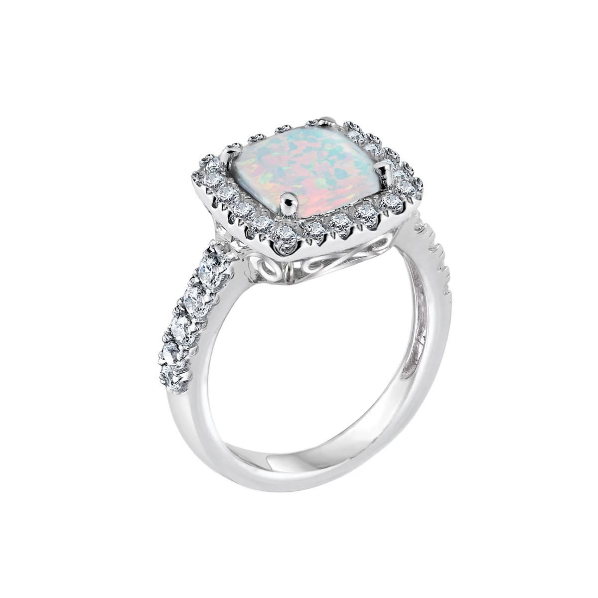 Description Gemstone Classics™ sterling silver cushion cut created opal and white sapphire halo ring. Material: Opal, Sterling Silver Item #: 54067 Pricing Disclosure