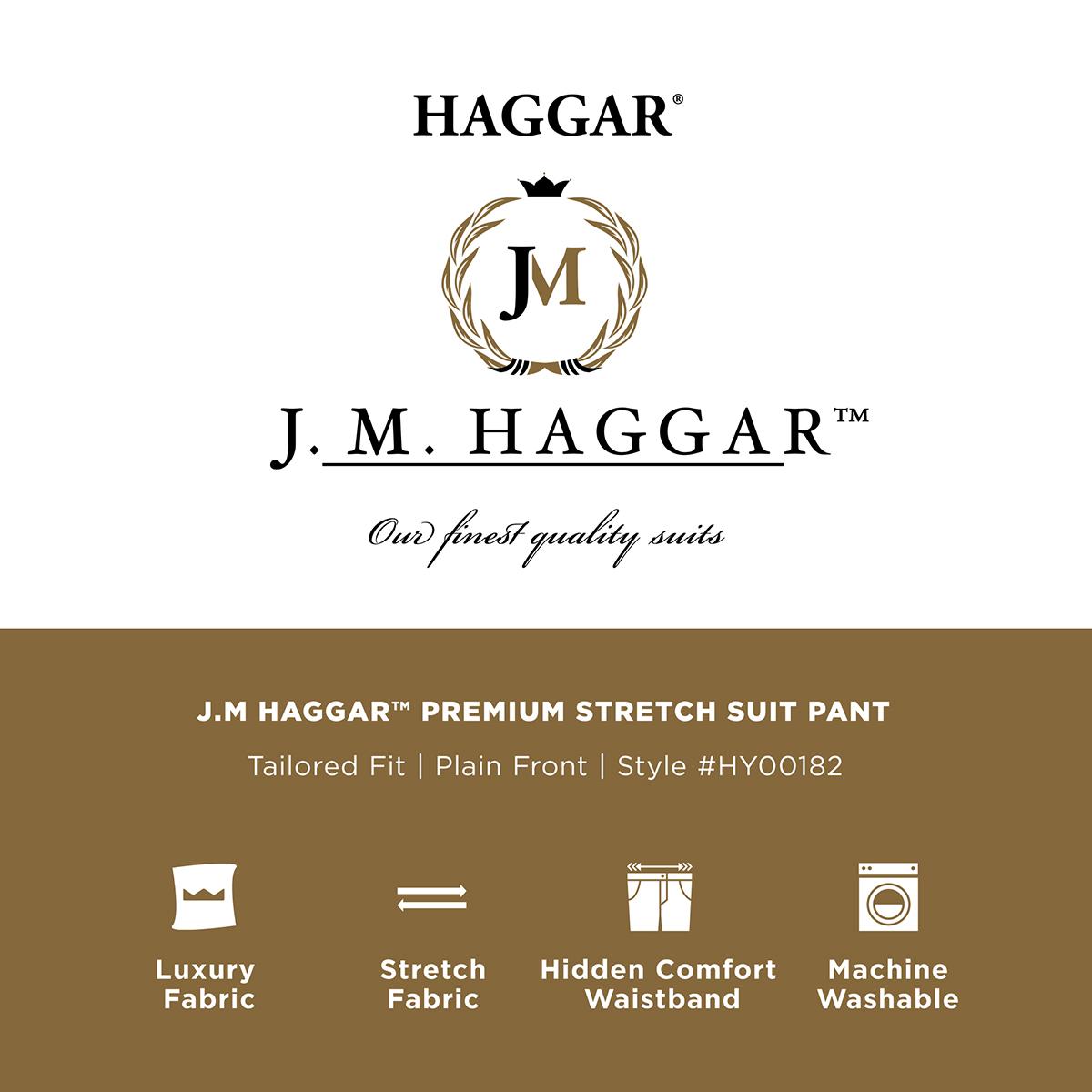 Description The J.M. Haggar suit collection checks all of the boxes. Featuring a hidden expandable waistband, hook and bar closure, off seam front pockets, single welt back...