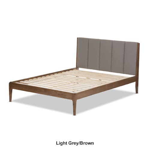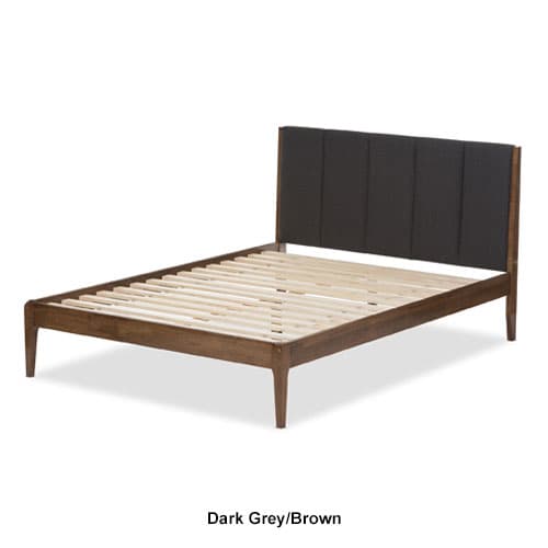 This Baxton Studio Ember mid-century wood queen platform bed features clean lines and flawless craftsmanship. The bed frame is constructed of solid rubber wood in an earthy tone walnut finishing matching with a panel-tufting cushioned headboard. It is upholstered in polyester fabric with exceptional softness and durability and exudes luxurious style in your bedroom sanctuary. The legs are tapered and shaped in a Scandi-style that complements the design of the bed while providing a stable base. 100% Polyester. Rubber Wood. Hardwood. LVL. Foam. Spot clean only. Dimensions: 42.1”H x 62.2”W x 85.2”D.