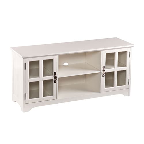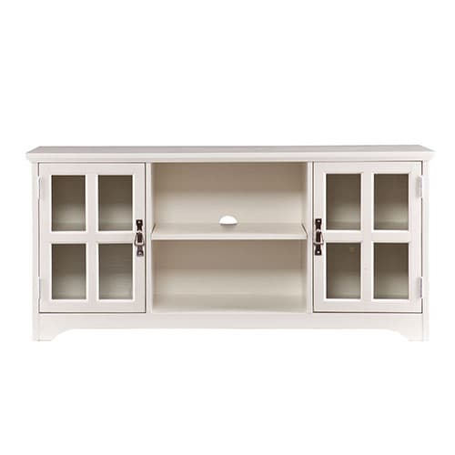 The Southern Enterprises Remington TV and media stand will bring a touch of rustic allure into your home. It is capable of displaying up to a 50 inch wide flat panel TV and the crisp white finish with brushed nickel hardware adds contemporary styling. The large center area and windowpane cabinets each contain an adjustable shelf for convenient, versatile storage. Made with Poplar, MDF and tempered clear glass. Dimensions: 24.3”H x 52”W x 15.8”D.
