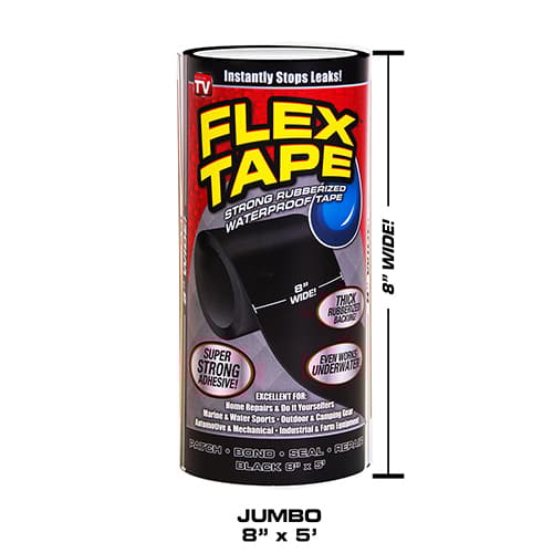 As Seen On TV Flex Tape - 8" x 5´ - clear, white or black. Super strong. Waterproof that instantly stops the toughest leaks. Grips on tight and bonds instantly. So strong it even works under water. Triple thick adhesive virtually welds itself to most surfaces. Fix pools and spas without even draining them. Available in super wide sizes to patch large holes.
