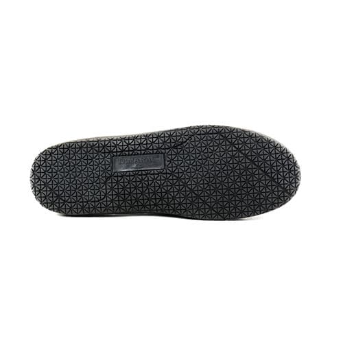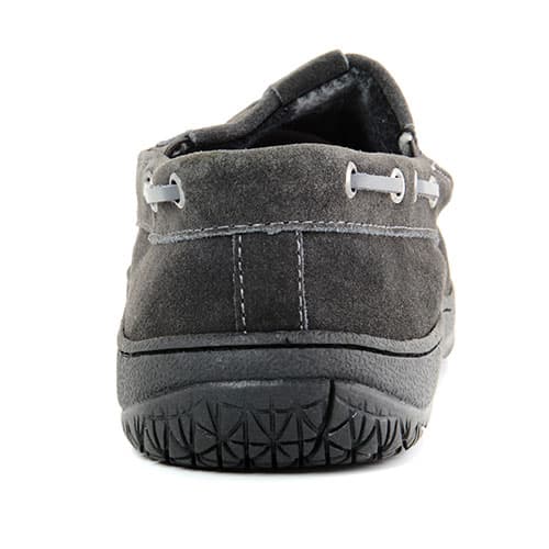 Mens Colton slippers with a genuine cowhide suede upper, a moc toe, 2 elastic details for a secure fit, padded collar, soft microfleece lining with a plaid print, cushioned footbed, and a flexible indoor, outdoor outsole.