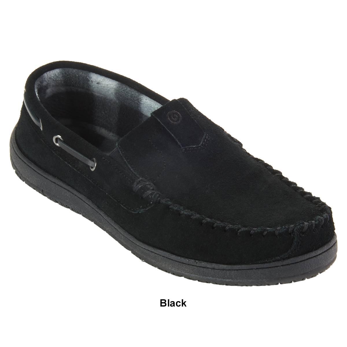 Description Mens Colton slippers with a genuine cowhide suede upper, a moc toe, 2 elastic details for a secure fit, padded collar, soft microfleece lining with a plaid print,...