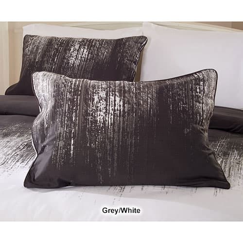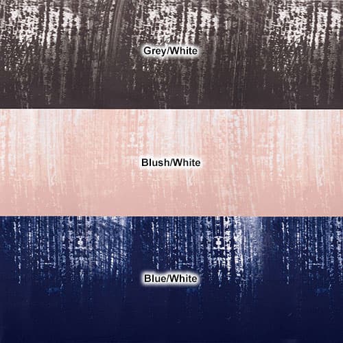 The Vince Camuto Lyon comforter set showcases a panel print with a splash of grey brushstroke on a clean white cotton sateen background. The included accessories remain simple and clean with the same texture of midnight blue and crisp white. Face is 100% cotton, reverse is 100% microfiber. 100% Polyester Fill. Machine wash.