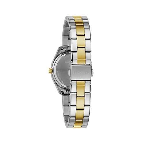 The Womens Caravelle two-tone crystal sport watch is perfect for all-day dazzle! The updated boyfriend design sparkles with 48 individually hand set crystals. It features stainless steel with a two-tone gold and silver finish, a patterned silver and white sunray dial, a calendar, and a double-press fold over clasp closure. Case Dimensions: 28mm.Style 45M113.Limited Manufacturer´s Warranty.