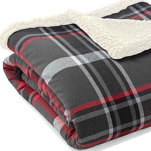 The Eddie Bauer Sycamore throw features a grey, black and red plaid design with black fleece on the reverse. This throw will look great in any room and will keep you warm and comfortable.100% Polyester. Machine wash, cold. Tumble dry, gentle. Size: 50” x 60”.