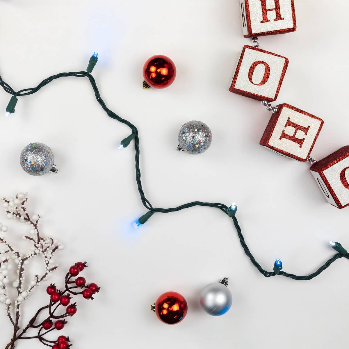 Northlight Seasonal 50 count LED wide angle holiday lights that feature 50 blue and white lights on a 17.5 foot green wire. If one bulb burns out, the rest will stay lit. This light set comes with end-to-end connectors which allow you to connect multiple sets together, not to exceed 210 watts, durable non-glass replacement bulbs, and spare fuses. Lights are equipped with Lamp Lock feature which makes them replaceable, interchangeable and keeps them from falling out. Cool to the touch. Spot clean only. UL listed for indoor and outdoor use.