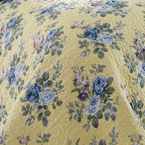 The Laura Ashley® Linley quilt set features beautiful blue flowers and green leaves on a lovely yellow background. This quilt reverses to display a yellow and blue striped pattern. 100% Cotton. Machine wash, cold. Tumble dry, gentle.