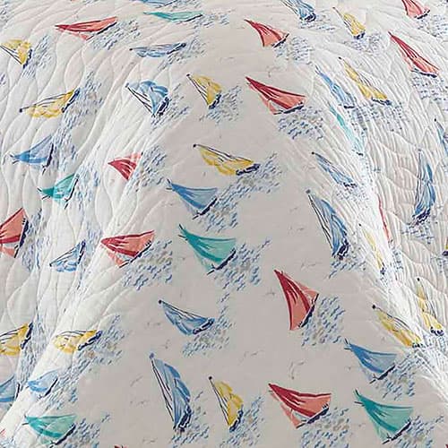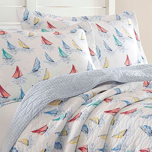 The Laura Ashley® Ahoy quilt set features a playful pattern of brightly colored sailboats that will bring seaside cottage charm to your bedroom and offers comfort and softness in pre-washed cotton. A crisp shirting stripe in blue and white on the reverse and accent binding is a casual complement to cheerful boats. 100% Cotton. Machine wash, cold. Tumble dry, gentle.
