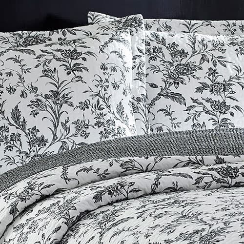 The Laura Ashley® Amberley black quilt set features a floral toile design that has a timeless, classic and dramatic appeal in black and white. This set is pre-washed for additional softness and reverses to a small scale diamond lattice print providing a pleasing contrast that frames the floral as it trims the edges of the quilt. 100% Cotton. Machine wash, cold. Tumble dry, gentle.