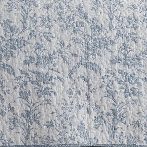 The Laura Ashley® Amberley blue quilt set features a floral toile design that has a timeless, classic and dramatic appeal in blue and white. This set is pre-washed for additional softness and reverses to a small scale diamond lattice print providing a pleasing contrast that frames the floral as it trims the edges of the quilt. 100% Cotton. Machine wash, cold. Tumble dry, gentle.