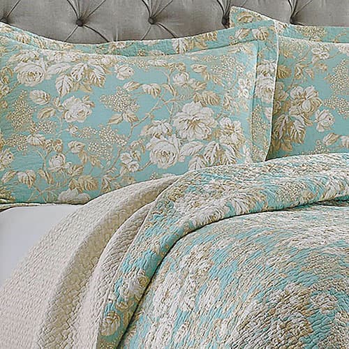 Description The Laura Ashley® Brompton quilt set features antique white roses highlighted against a rich aqua jade that updates this classic pattern. A taupe and white mini...