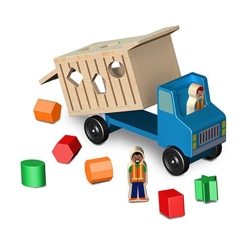 The Melissa & Doug® shape-sorting dump truck features The nine brightly-colored shaped wooden blocks fit into cut-outs on three sides of the dump truck, making a satisfying "clunk" as they land in the hardwood truck bed. Wheels roll smoothly to deliver the blocks anywhere. Lift the back door and tilt the container to dump the blocks and start again! Two included play figures fit snuggly into the cab of the truck. Materials: Wood. Plastic.