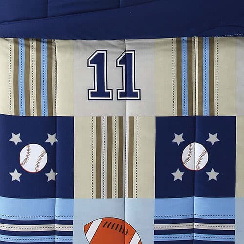 The My World Kids denim and khaki sports comforter set features sports for every season. 100% Microfiber Polyester. 100% Polyester Fiber Filling. Machine Wash.
