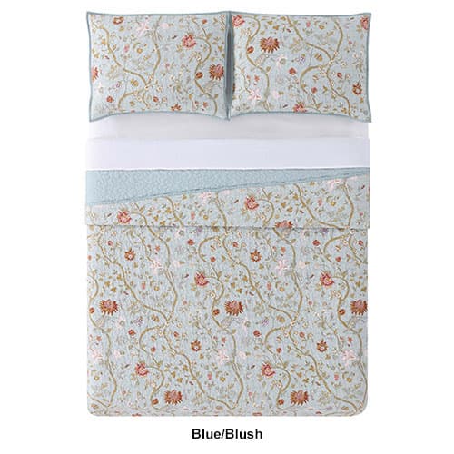 This Style 212 Bedford quilt set features a classic floral scroll print with vines and flowers while reversing to a solid color. Face: 100% Cotton. Reverse: 100% Microfiber. Machine Wash.