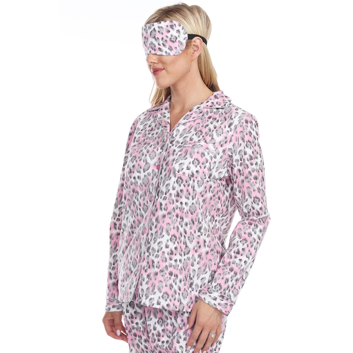 The Womens White Mark grey cheetah pajama set is very comfortable to touch and wear. The three-piece sleep set features a long-sleeve button-down top, long leg regular fit pants, and an eye mask. This set has a breathable fabric for your comfortable sleeping.