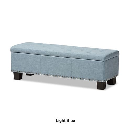 This Baxton Studio Hannah storage ottoman bench will be perfect as a bed end bench for your bedroom or as an accent piece in your living space. It has hidden storage that doubles as additional seating and is constructed of an eco-friendly solid rubberwood frame for sturdiness and durability. The ottoman is upholstered in a soft polyester blend fabric. The hinged lid includes a cushioned finish for plush comfort, making storage box suitable as extra seating. Its beautifully finished with silver nail heads trim and the storage bench features a diamond-shaped button-tufting design with deep storage space for added functionality. To complete the look, the storage trunk is sitting on four solid rubberwood chunky feet for a strong foundation. Spot clean only. Dimensions: 17.3”H x 52.2”W x 16.7”D.