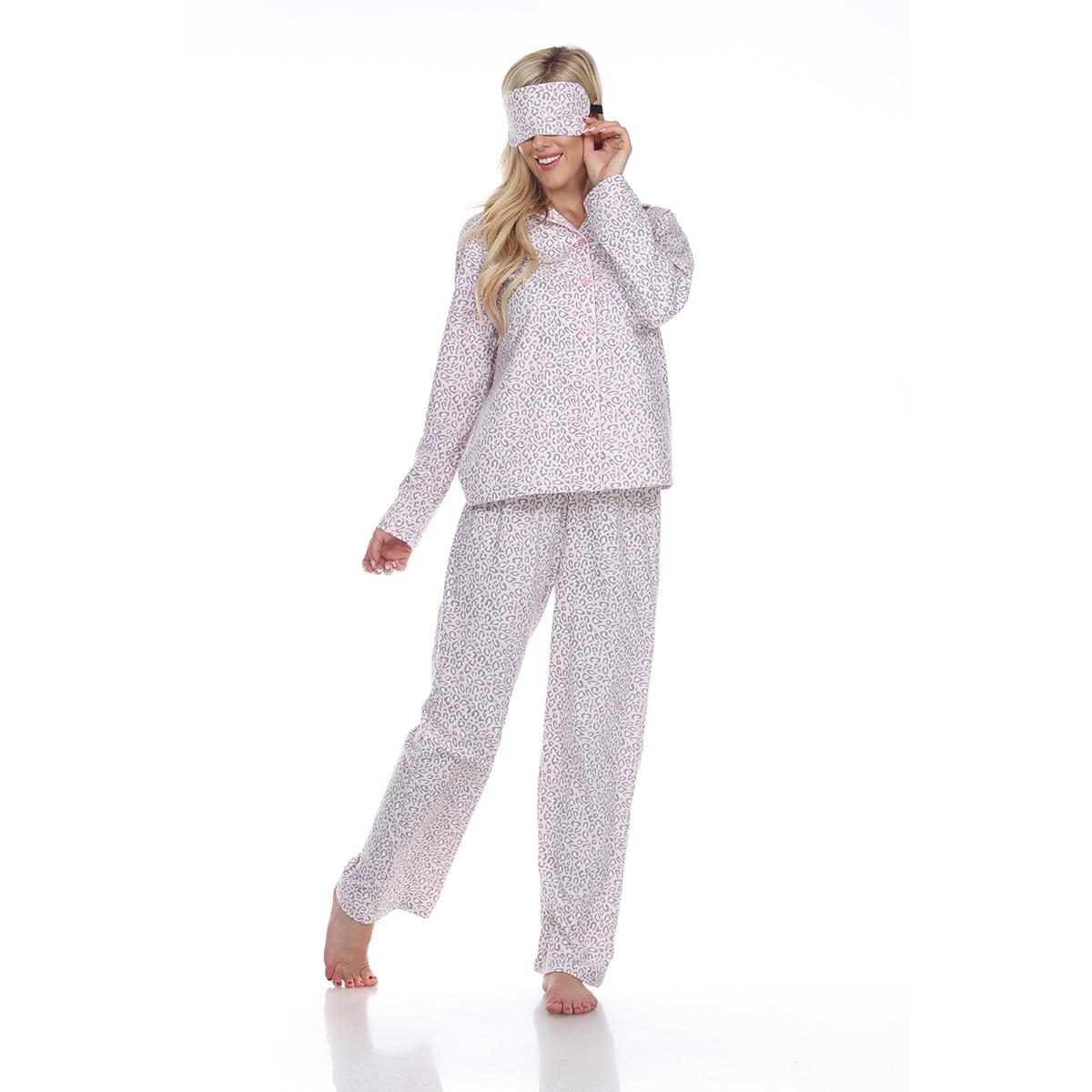 The Womens White Mark pink cheetah pajama set is very comfortable to touch and wear. The three-piece sleep set features a long-sleeve button-down top, long leg regular fit pants, and an eye mask. This set has a breathable fabric for your comfortable sleeping.