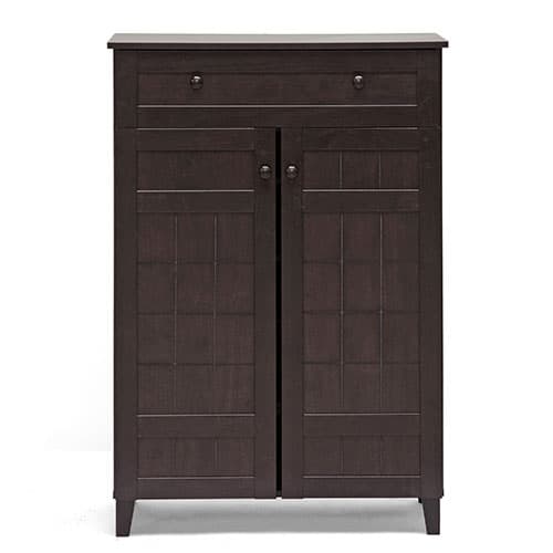 This Baxton Studio Glidden wood modern tall shoe cabinet unobtrusively tucks away shoes yet keeps them close at hand for a quick walk with the dog or trip to the office. This contemporary shoe storage option is made of MDF and engineered wood with dark brown faux wood grain paper veneer. It has five fixed height horizontal shelves that are ideal for adult and children’s shoes alike, though boots are not recommended. Atop the cabinet doors is a single drawer for additional storage. Wipe clean with a damp cloth. Dimensions: 45.1”H x 30.8”W x 15.1”D.