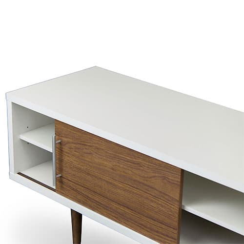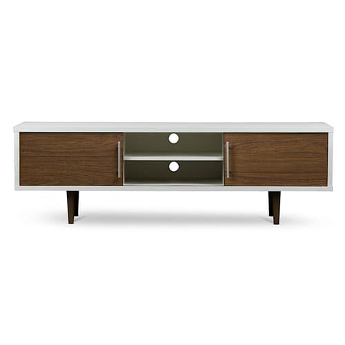This Baxton Studio Gemini wood contemporary TV stand boasts a compellingly contrasting white and walnut faux wood grain paper veneer. This TV stand brings sensational styling to your entertainment center with genuine metal sliding door pulls and tapered black legs that create a dynamic presence. Wipe with a damp cloth to clean. Dimensions: 21”H x 66”W x 18”D.